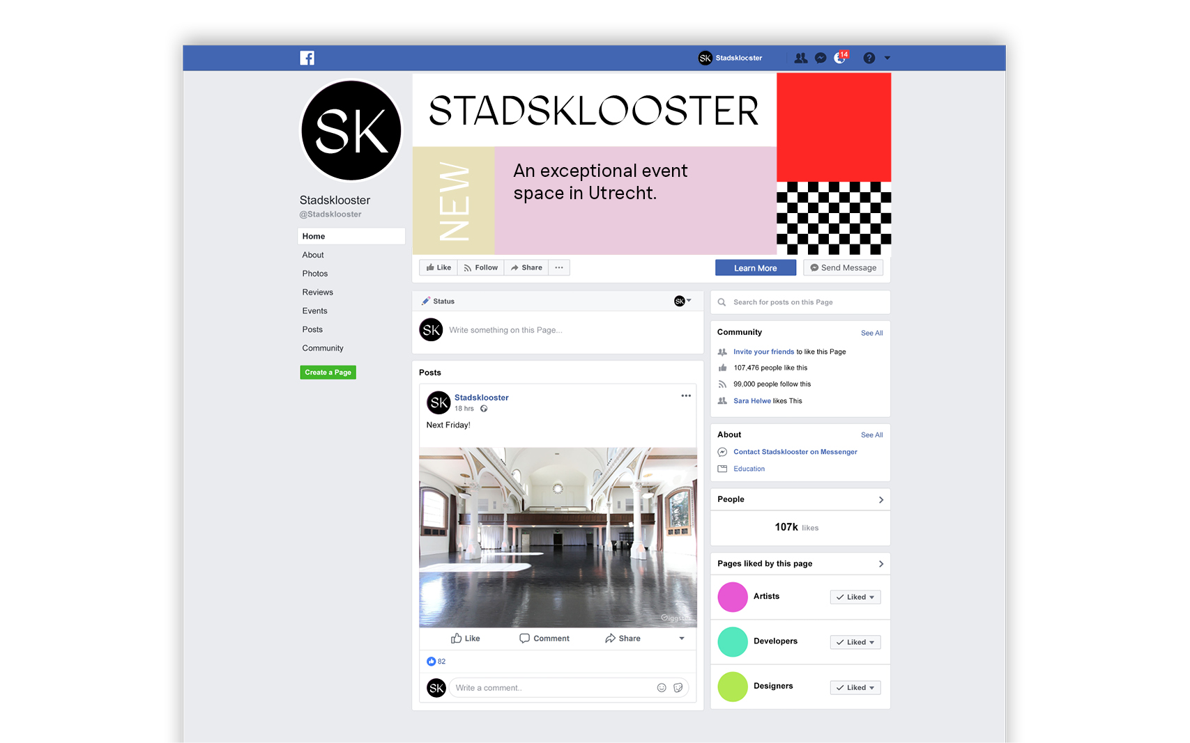 Stadsklooster is an event location and community cultural center located in a splendid Antonius church in Utrecht. The building itself came as a main source of inspiration for the new visual identity. The colour scale, the checkered pattern, all of it was there waiting to be withdrawn and mixed up with some refreshing typography for a slightly daring and appealing branding. The result is a great symbiotic contrast of the puristic geometry of the 20’s city monastery and a vivid contemporary visual approach, that links subtly to its origins. A project in collaboration with designer Iveta Bláhová.